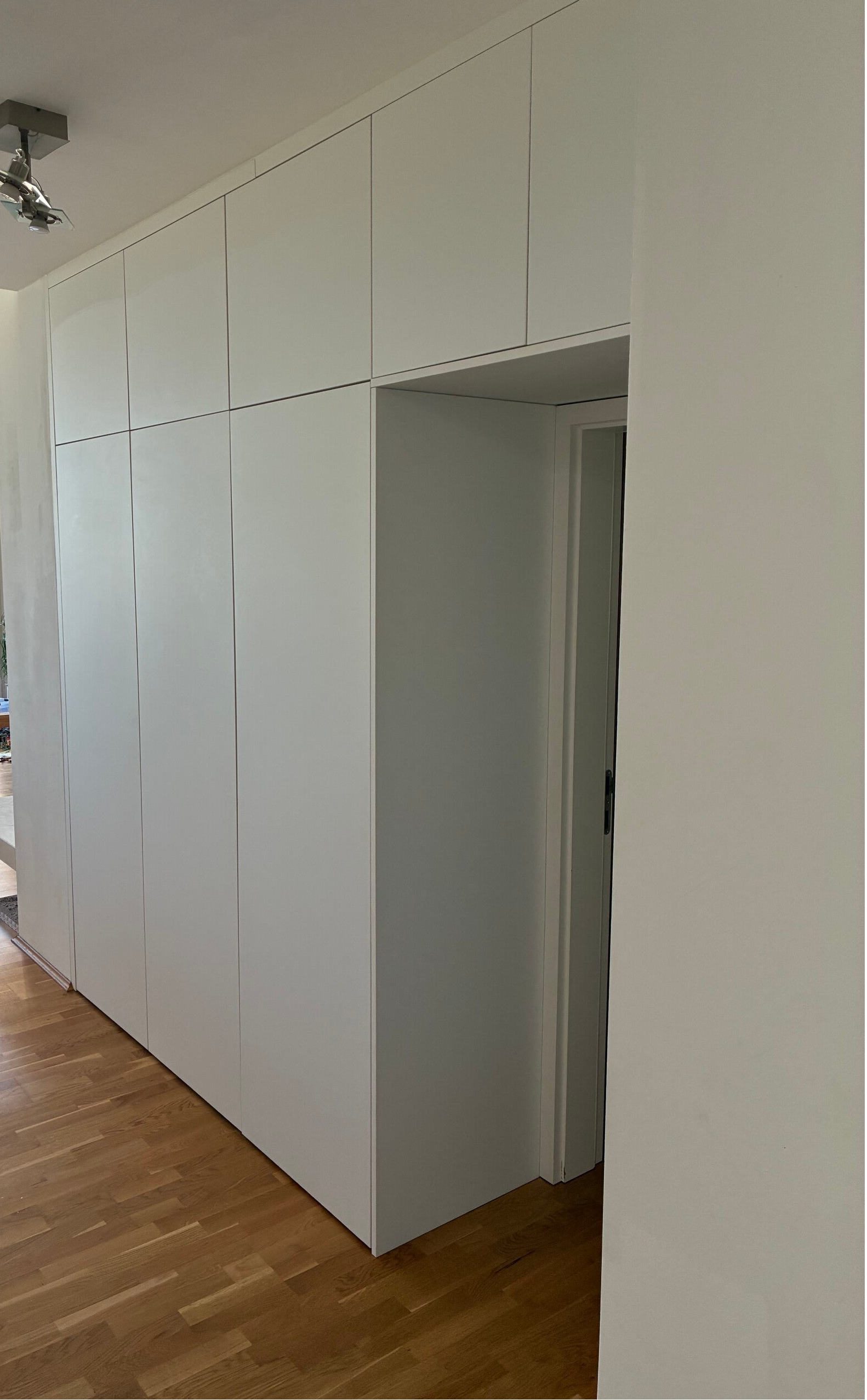 Weiße matte Schrankwand mit pflegeleichter Oberfläche – nahtlos in die Wand integriert. Ein unauffälliger Stauraum, der im Inneren überraschend viel Platz bietet.